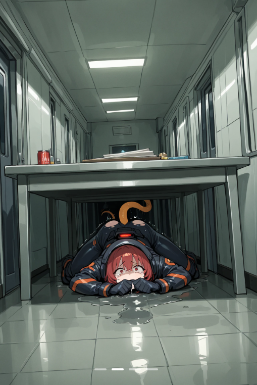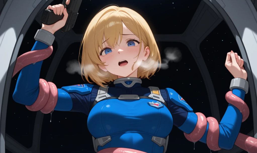 今回はエイリアンが徘徊する宇宙船の中を隠れながら逃げまどう女性を生成したくてチャレンジ。助手にそういった旨を伝えてプロンプトを用意してもらった。