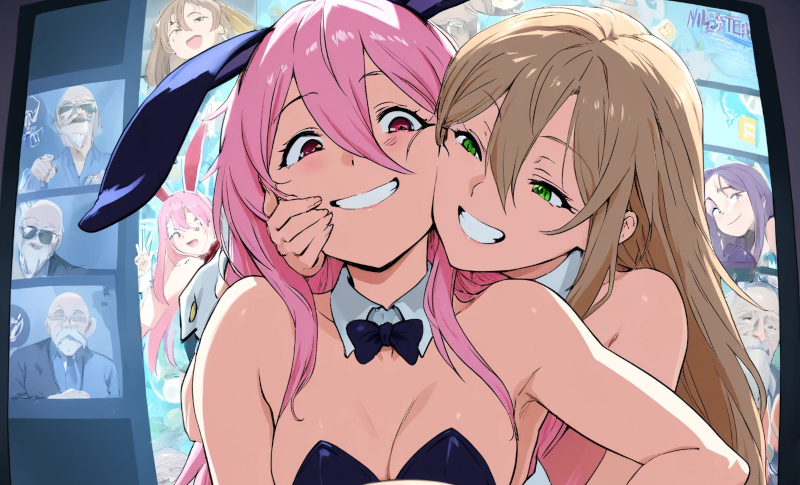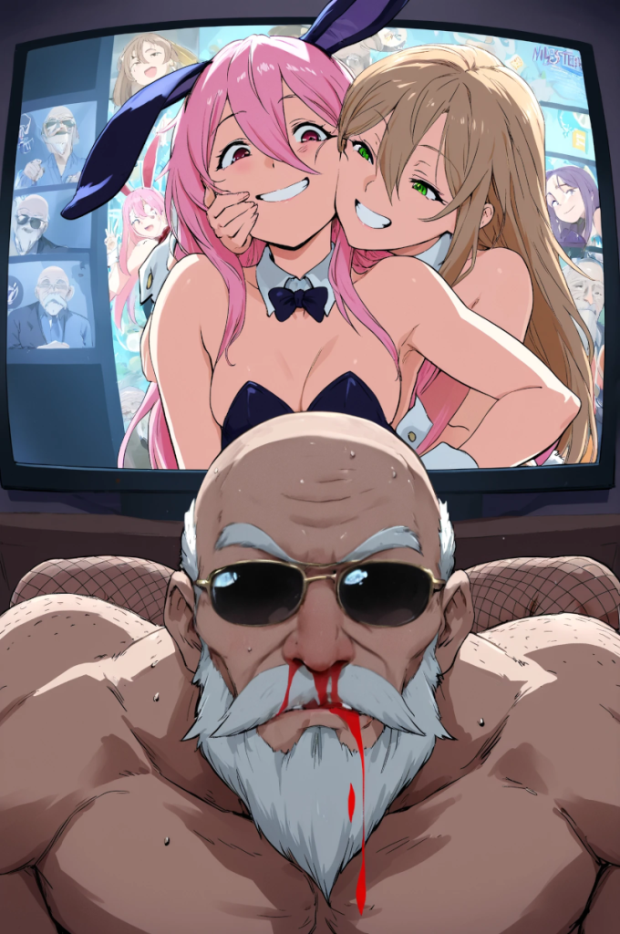 亀仙人がバニーガールと戯れてるCGを生成したかったけど、一方的に視聴してる絵面に。背もたれかと思ってたけど、よく見たら、バニーのフトモモかこれ。AIのCGはほんとに想像外の構図してるときあるなぁ。