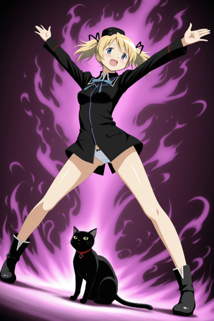昨日デイリーテーマは「魔女と黒猫」でした。 AI X Facebook はてブ Pocket LINE コピー 2025.08.30 この黒猫がなかなか黒くならなくて。 こんな感じで女の子の方が黒くなるありさま。そしてこのモデルだと魔女はなにも記述してないとストライクウィッチーズ風味なるもよう。 それならばと 服装ストライクウィッチーズ、画風まどかマギカでいってみるかと、こちらの画像をつくりだしたところ、登録時点でレギュレーション違反で弾かれた! パンツじゃないから恥ずかしくないのに!