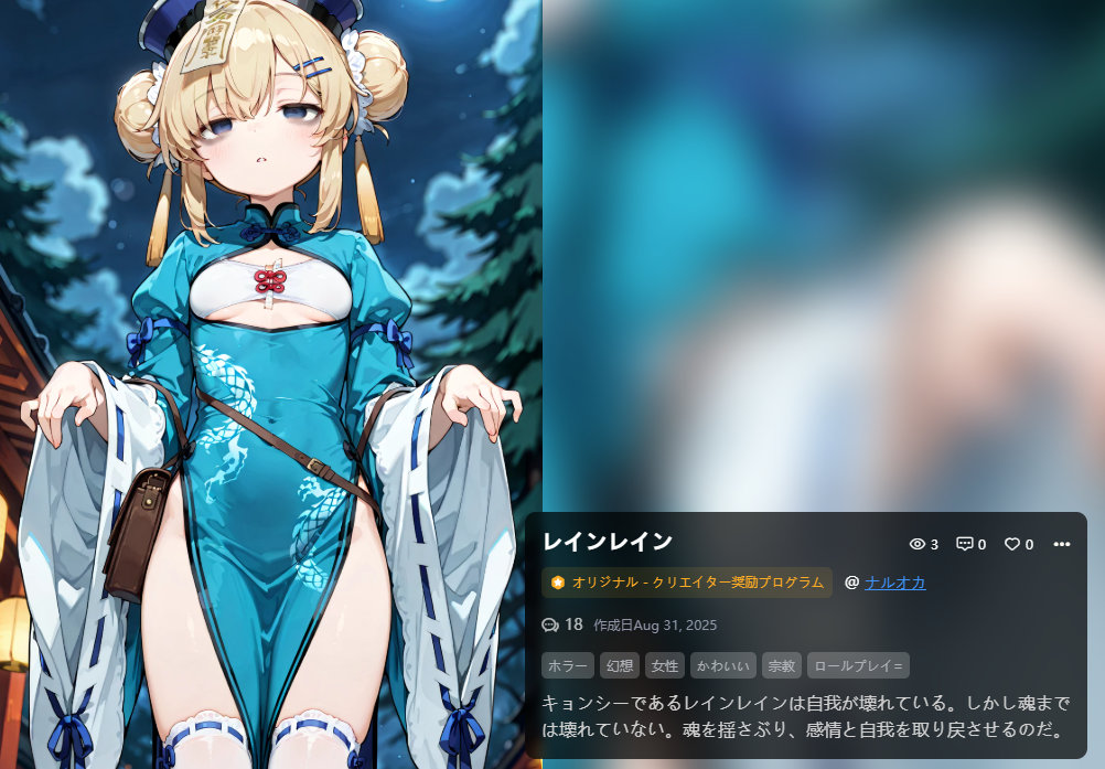 時流的に追加画像を用意したAIキャラクターがいいっぽいけど、差分的な画像って難しいんだよなぁと思いながら。なんか思いついたらやってみるかな。とはいえ、差分画像のあるAIキャラクターつくってなくはないんだけどね(´・ω・`)人に共感してもらえるもの作るのむずかしいね。