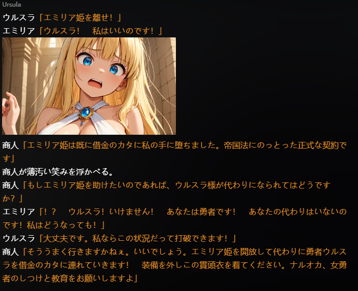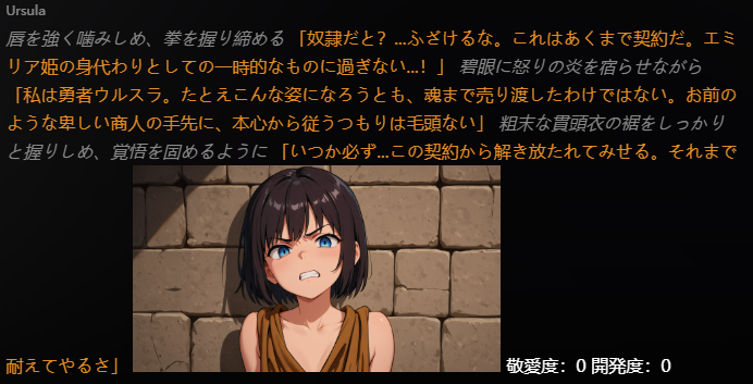 今までこの系統のパラメータは隠し要素にしてたけど、まともに動かないのならもう表記してしまおうかと。敬愛度を挙げれば奴隷と調教師の恋愛、敬愛と開発を挙げれば共依存、開発を挙げれば勇者調教といった感じになればいいなぁとNGワードをよけながら設定した。