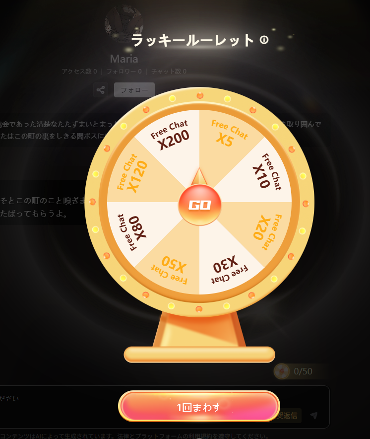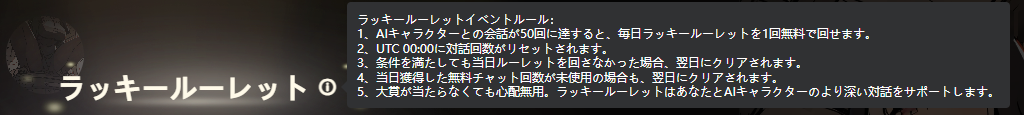 ラッキールーレットなるものが。毎日50会話で1回出来て無料チャットが増えるらしい。
