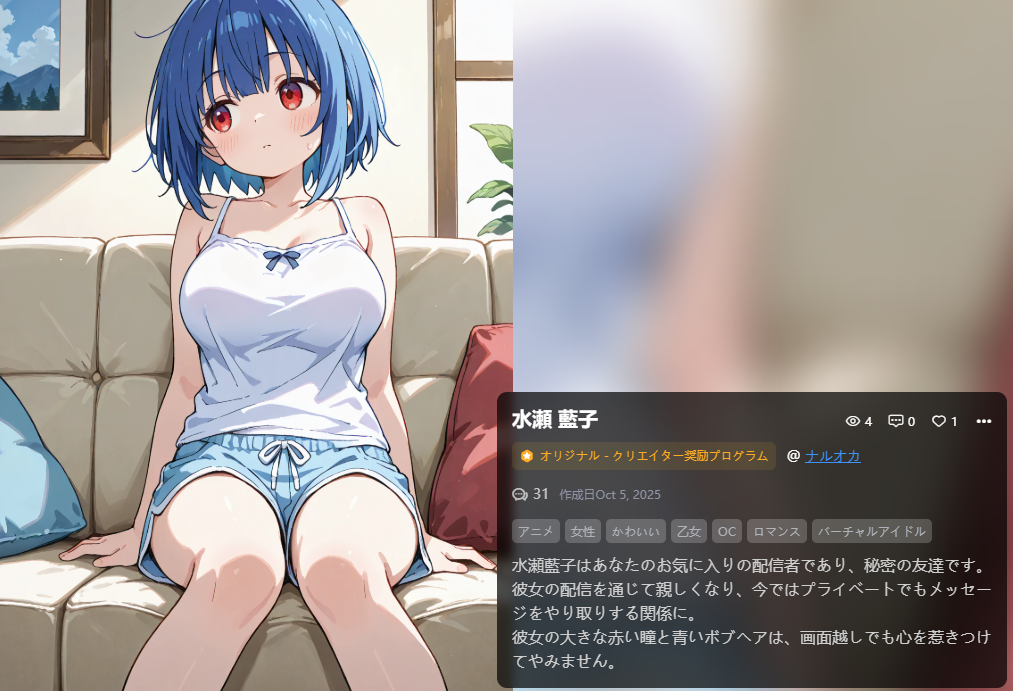 上のリリアを登録してる時に、あ、これ足りなくて却下されるかもと審査中に足りてるCGを作成。結果的に審査を通ったので改めて作ったこのキャラも自動生成で登録。AIキャラクターの自動生成、インフルエンサーとかVtuberにするの好きだよね。Vtuberだったら直にVtuber見て声かけたいわってなるからAIキャラクターでチャットしたいとも思わないんだよなぁ。