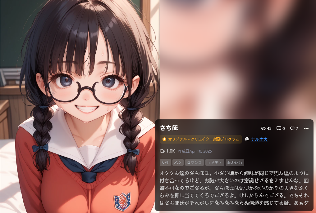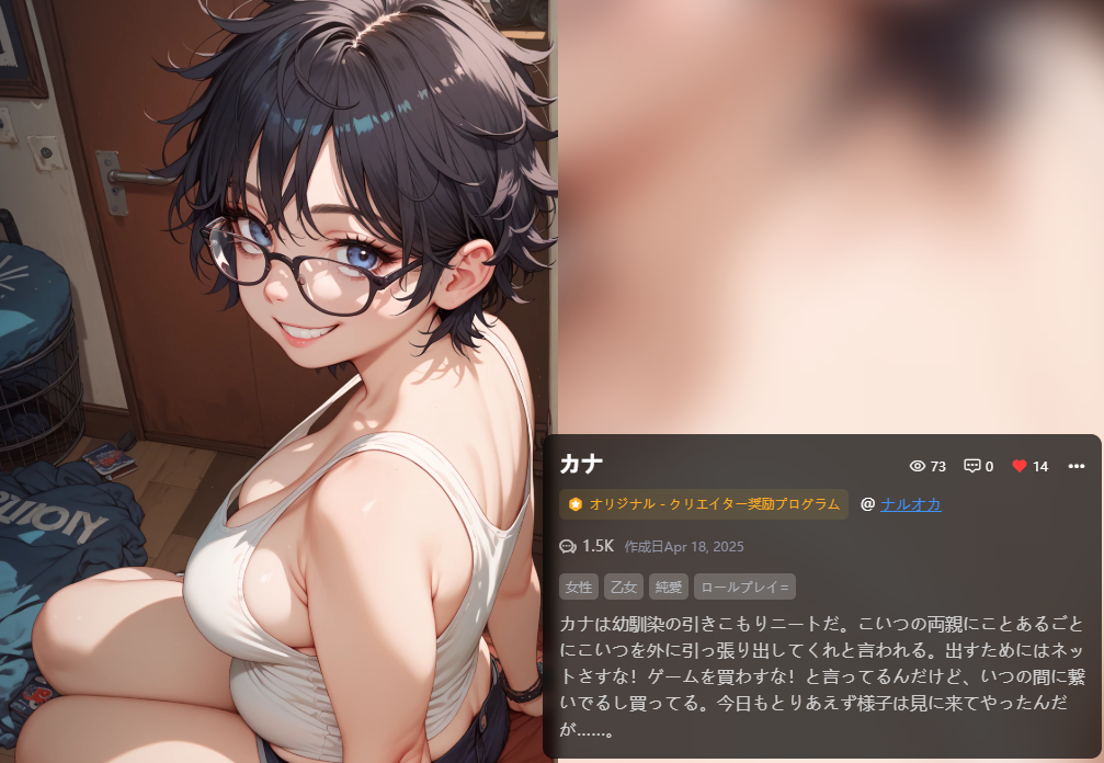 初期に作ったオタク言葉で話すオタク少女。話す側のユーザーの立ち位置も結構設定で決めちゃってる感。心の声モードがあって、内心は好意を寄せる乙女な感じで話が進むキャラクターです。