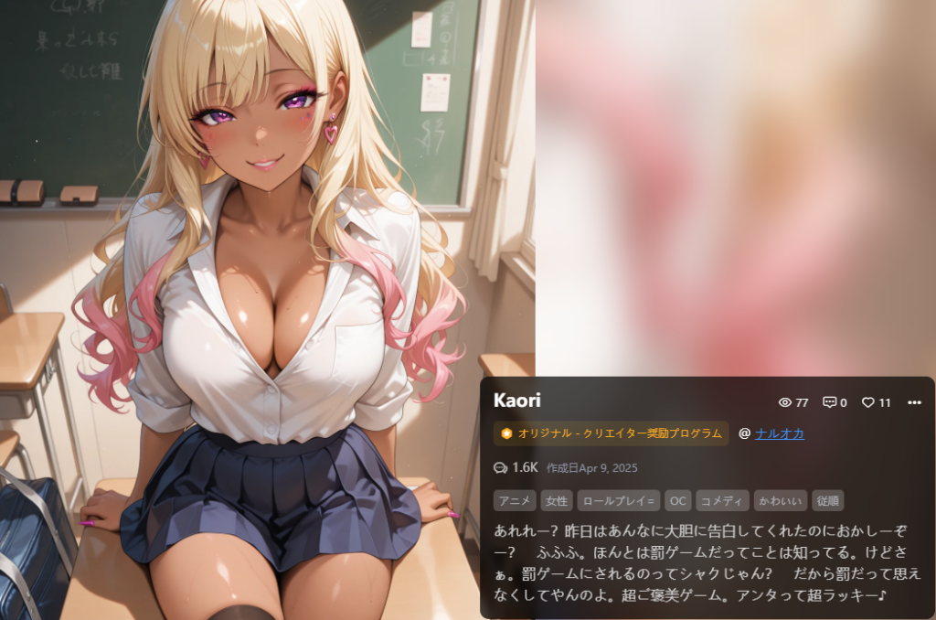 ギャル。定期的に作りたくなるギャルw 罰ゲームでカースト上位のギャルに告白したらOKもらえたっていうエロ漫画ですでにありそうな設定のキャラクターです。オタクにやさしいギャル。SeaArtの金髪ギャル毛先がピンクになりやすい説。
