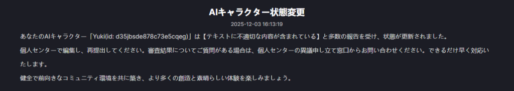 通報されたらこういうのが届くのか!多数の報告がきてそういう措置になるみたい。